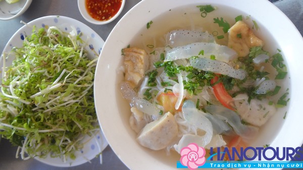 Tô bún để lại ấn tượng trong thực khách với vị ngọt thanh của nước dùng. Nước bún được ninh từ xương heo các loại cá biển tươi nên mang vị ngọt thanh nhẹ nhàng, không quá ngắt nhưng đậm đà. Sợi bún mảnh, trắng tinh. Tô bún được điểm thêm vài lát thịt cá luộc, một ít chả cá chiên vàng và không thể thiếu sứa biển giòn sừn sựt. Bún ăn kèm với rất nhiều rau thơm. Vì ngon-bổ-rẻ nên quán rất đông mà nhanh hết hàng, vì vậy để chắc chắn được thưởng thức món này, bạn hãy đến sớm một chút nhé