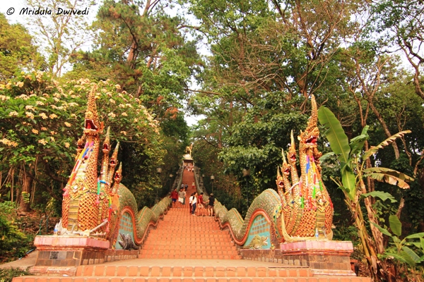 Khám phá Doi Suthep: Bạn hãy từ từ leo qua 300 bậc thang để lên đỉnh núi Doi Suthep, chiêm ngưỡng những bức tượng thần Rắn ở 2 bên đường. Điểm dừng chân đầu tiên là một ngôi đền trên đỉnh núi. Nếu may mắn gặp hôm thời tiết đẹp, bạn có thể phóng tầm mắt ngắm nhìn toàn thành phố Chiang Mai từ trên cao. Hãy khởi hành vào buổi sáng sớm và mang theo máy ảnh để ghi lại những khoảnh khắc cho riêng mình.
