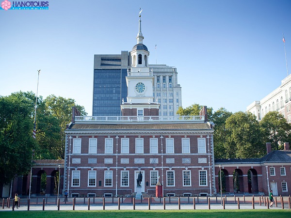 - Đoàn tham quan Dinh Độc Lập (Independence Hall) – Hiện nay tòa nhà được bảo tồn nguyên vẹn, trước đây nơi này diễn ra cuộc họp thống nhất 13 bang của nước Mỹ và là nơi diễn ra rất điều sự kiện lịch sử quan trọng của buổi đầu khai sinh Hoa Kỳ. Nơi đây cũng chính là trụ sở của Lưỡng viện Quốc hội Mỹ thời kỳ non trẻ