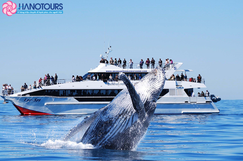 Quý khách di chuyển lên du thuyền, ra vịnh và đợi chờ cơ hội được tận mắt chứng kiến loại động vật có vú lớn nhất trên thế giới nổi lên giữa biển khơi (Quý khách chỉ có thể lên tàu nếu thời tiết cho phép - trường hợp ngày biển động và ban quản lý thông báo đoàn không thể lên thuyền, quý khách sẽ tham quan thị trấn trên bờ và cũng có thể có cơ hội được nhìn thấy cá voi gần bờ)