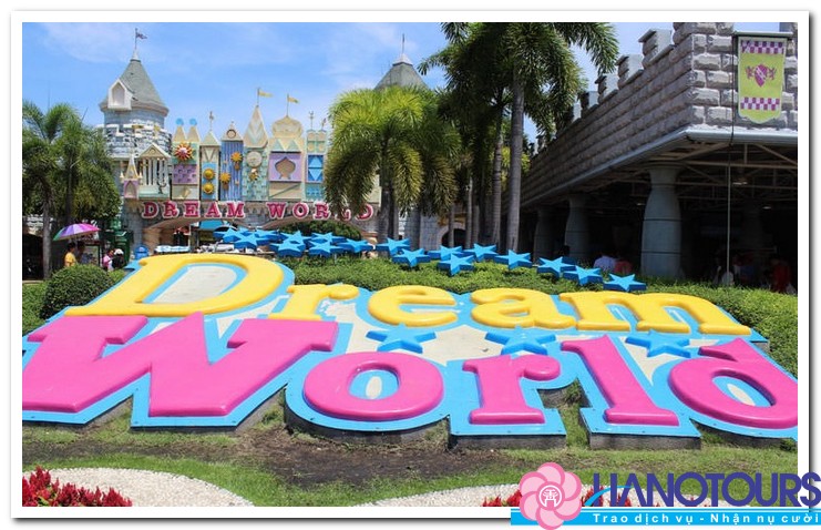 Khi mới vào cổng, bạn sẽ ấn tượng với dòng chữ “ Dream World ” đặt trên thảm có xanh, người ngoài hành tinh xanh và lâu đài thời kỳ trung cổ.