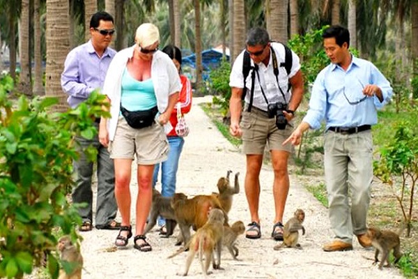 10h30: Tàu cập vào Đảo Khỉ, tại đây Quý khách tự do nghỉ ngơi thăm quan tắm biển. Tiếp theo, tàu cập bến Việt Hải, Quý khách đi xe đạp qua đường mòn xuyên cánh rừng để đến thăm làng Việt Hải và thăm vườn quốc gia Cát Bà. Sau đó quay trở về lại bến và lên tàu dùng bữa trưa trên vịnh Lan Hạ.