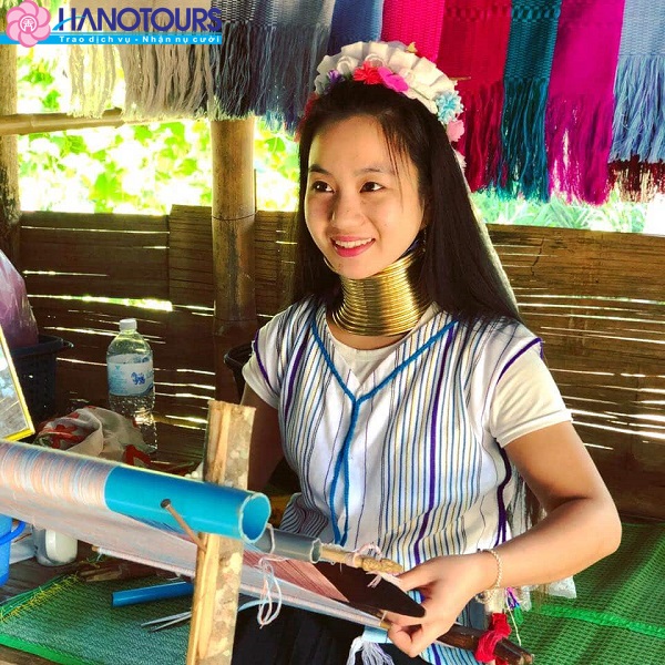 - Xe đưa đoàn di chuyển đến Làng Cổ dài (Long Neck Village) tham quan và tìm hiểu những tập tục truyền thống của người dân tộc thiểu số Karen. Người Karen vốn có nguồn gốc từ Myanmar, nhưng do những yếu tố về kinh tế và chính trị nên họ dần di chuyển sang Thái Lan sinh sống và định cư. Họ có tập tục độc đáo là đeo vòng trên cổ, vì theo quan niệm truyền thống người Karen là con cháu của Phượng hoàng nên cổ càng dài sẽ càng đẹp và thanh cao, ngoài ra số lượng vòng trên cổ càng nhiều càng chứng minh cho sự giàu có và sung túc của gia đình.