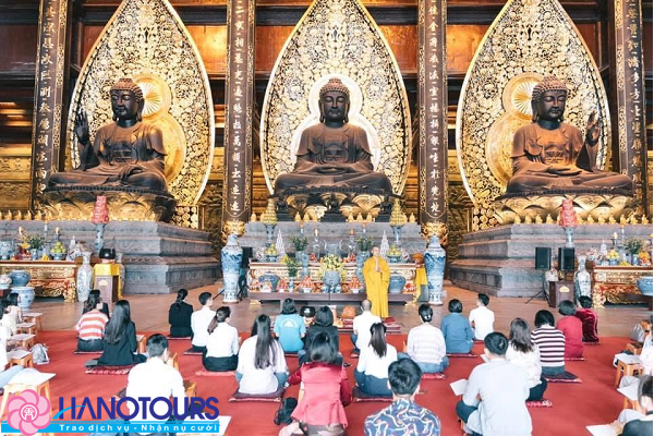 - Rời du thuyền, quý khách tiếp tục tham quan điện Tam Thế với kiến trúc chạm trổ tinh xảo, có 3 pho tượng Tam Thế đại diện cho quá khứ, tương lai và hiện tại. Sau đó, khách tới điện Pháp Chủ có 4 bức phù điêu lớn, bao trùm toàn bộ tường trong điện, kể về những giai đoạn trong cuộc đời đức Phật Thích Ca Mâu Ni. Du khách đi tiếp tới điện Quan Âm thờ Phật ngàn mắt ngàn tay. Ra bên ngoài, quý khách sẽ đến với vườn cột kinh với những cột kinh cao hơn 13m, sừng sững giữa sân chùa.