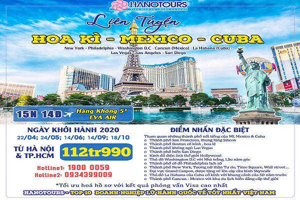 - Quý khách sẽ đi qua 8 thành phố nổi tiếng của Mỹ, Mexico và Cuba đặc biệt là những là những thành phố từ hiện đại náo nhiệt hoành tráng như New York, Washington DC đến những khu du lịch biển đẳng cấp thế giới tại Cancun và trải nghiệm Cuba cổ kính - hình ảnh của chính chúng ta trước đó 50 năm….và cuối cùng về lại miền viễn Tây Hoa Kỳ nơi có những hẻm núi đá màu đặc biệt được công nhận là Di sản thiên nhiên thế giới, tham quan và trải nghiệm những cảnh đẹp độc đáo, đa dạng…
