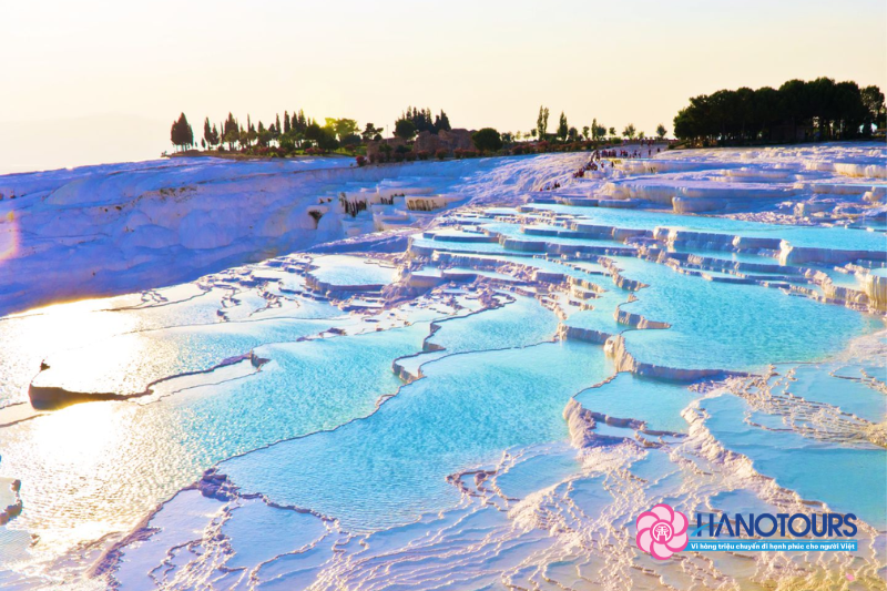 Sau bữa trưa, đoàn khởi hành đi Pamukkale - Đây là một điểm đến hấp dẫn nhất nhì Thổ Nhĩ Kỳ bởi vẻ đẹp khó tin chỉ xuất hiện trong những bộ phim khoa học viễn tưởng của nó. Nếu chỉ nhìn trên ảnh hay những thước phim từ trên cao, người ta dễ nhầm lẫn đây là một núi tuyết khổng lồ nhưng thật ra đó chính là một vùng núi đá vô canxi cacbonic được tích tụ hang nghìn năm với hình dáng như những hồ nước xếp thành từng tầng được tạo thành bởi quá trình biến đổi. Nước trong những “hồ bông” này là nước khoáng tự nhiên được hình thành từ mạch khoáng ngầm với màu xanh da trời và chứa nhiều khoáng chất có lợi cho sức khỏe và có thể hỗ trợ chữa bệnh.