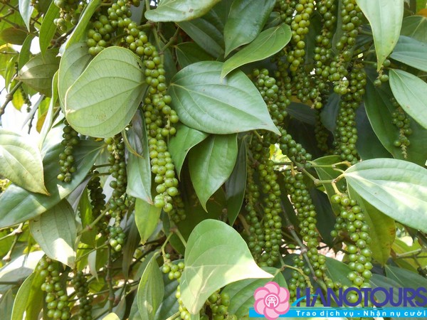Bước chân đến vườn tiêu, bạn không thể không trầm trồ về khung cảnh ngoạn mục nơi đây. Những cây tiêu cao ngút mắt, xanh rờn, được trồng thẳng tăm tắp. Những chùm tiêu xanh, những chùm chín đỏ nằm xen kẽ trong từng lớp lá. Tiêu ra trái theo từng chùm dài và được đựng trong cần xé lớn. Thu hoạch xong, người ta đổ tiêu ra phơi khô dưới nắng, màu sắc cũng theo đó mà chuyển dần từ màu đỏ ối sang đen đậm. Để tiêu khô, phải phơi ít nhất dưới mười nắng rồi mang đi sàng sẩy cho sạch bụi.