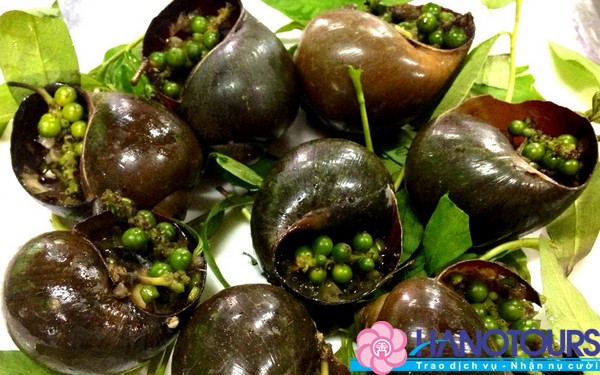 Ốc bươu to tròn, bám đầy ở kênh rạch hay các ao hồ, từng con to đen bóng. Khi bắt về, người ta mang ngâm với nước gạo trong 8 - 10 tiếng để ốc nhả sạch bùn đất, rồi mang đi rửa kĩ, chặt đít. Tiếp đến ướp ốc với tiêu, gia vị khoảng 10 phút rồi nướng. Ốc chín thơm lừng, thịt chắc, giòn, bùi bùi, mùi tiêu nướng hấp dẫn.