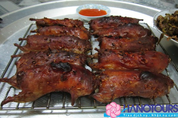 Chuột nướng muối ớt là món ăn du khách sẽ thấy khá phổ biến trong chuyến du lịch miền tây. Món ăn khá kinh dị này không phải ai cũng dám thử nhưng một khi đã thử thì chắc chắn sẽ rất thích thú. Chuột sau vụ lúa trở nên béo tròn, được bắt về, làm sạch, sơ chế kỹ, ướp gia vị trong một tiếng cho thấm rồi mang đi nướng vàng. Thịt chuột có vị gần giống với thịt gà, thơm, béo, ăn với dưa chuột, rau răm và muối ớt.