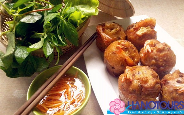 Khi chiên, mùi thơm của lớp vỏ bột gạo, của đậu xanh quyện với mùi thịt heo xay, thơm lừng cả một góc phố. Mỗi khi ăn, người ta cắt chiếc bánh ra làm bốn phần, gói ăn cùng xà lách và nhiều loại rau thơm, chấm với chén nước chấm chua ngọt và đồ chua. Lớp vỏ giòn tan, nhân bên trong thơm, mềm, beo béo, bùi bùi, vị tươi ngọt của thịt tôm cùng sự tươi mát của rau thơm, xà lách làm cho món này vô cùng hấp dẫn.