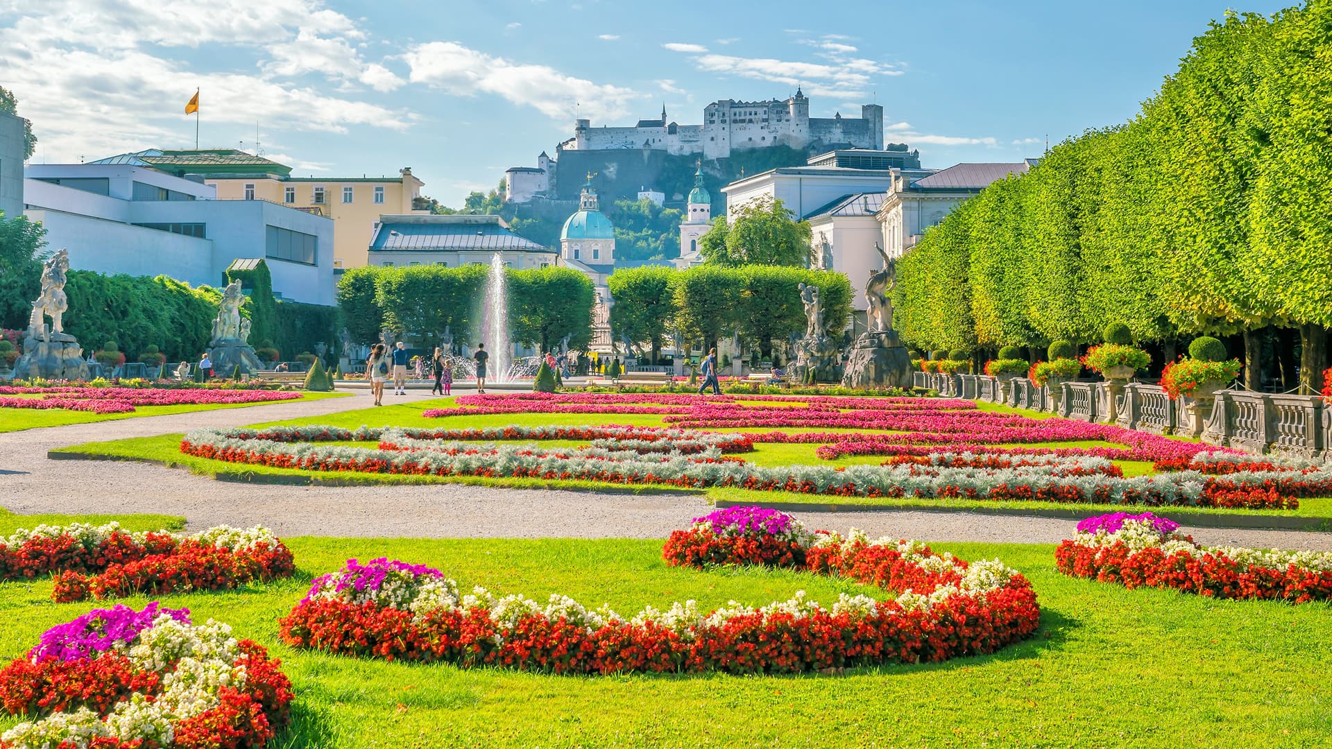 - Quần thể vườn thượng uyển Mirabell, Nhà của Mozart (tham quan bên ngoài). Vườn thượng uyển Mirabell là một mảnh ghép kiến trúc quan trọng của Salzburg tuyệt đẹp và lãng mạn được xây dựng từ năm 1690, nằm trong quần thể cung điện Mirabell, địa điểm đã mang lại nguồn cảm hứng cho Mozart viết nên những tuyệt phẩm âm nhạc của mình.