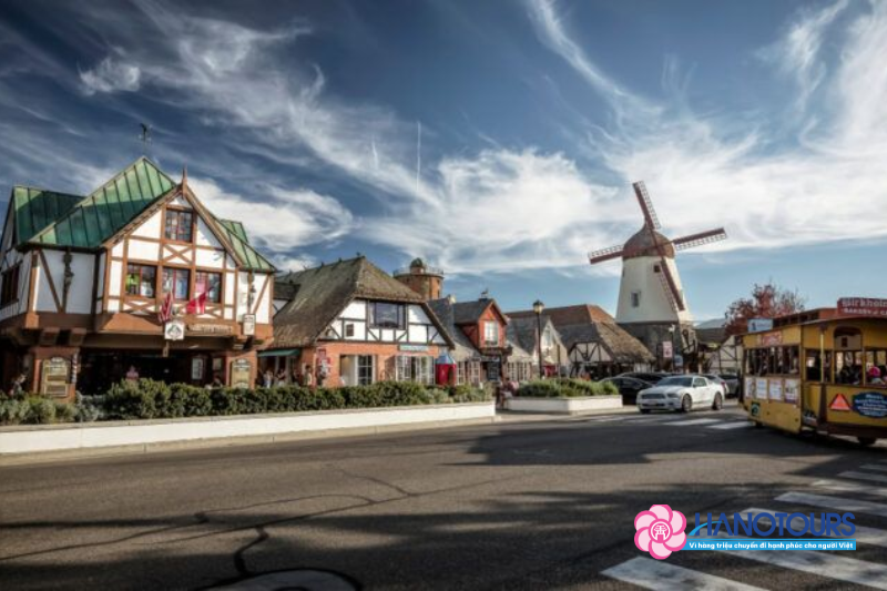 Quý khách dừng chân tham quan tại Làng Solvang - Tọa lạc ở hạt Santa Barbara, tiểu bang California, Solvang theo tiếng Đan Mạch có nghĩa là "những cánh đồng ngập nắng". Một thế kỷ về trước, thị trấn được khai sinh bởi một nhóm di dân người Đan Mạch muốn tìm nơi ấm áp để tránh mùa đông giá buốt ở vùng Trung Mỹ. Từ một vùng đất hoang sơ có diện tích 3.600ha, chỉ là nơi cho gia súc như ngựa, bò và cừu gặm cỏ, những người Đan Mạch xa xứ đã xây dựng nên một ngôi làng đầy dáng vẻ văn hóa nghệ thuật của quê hương mình.