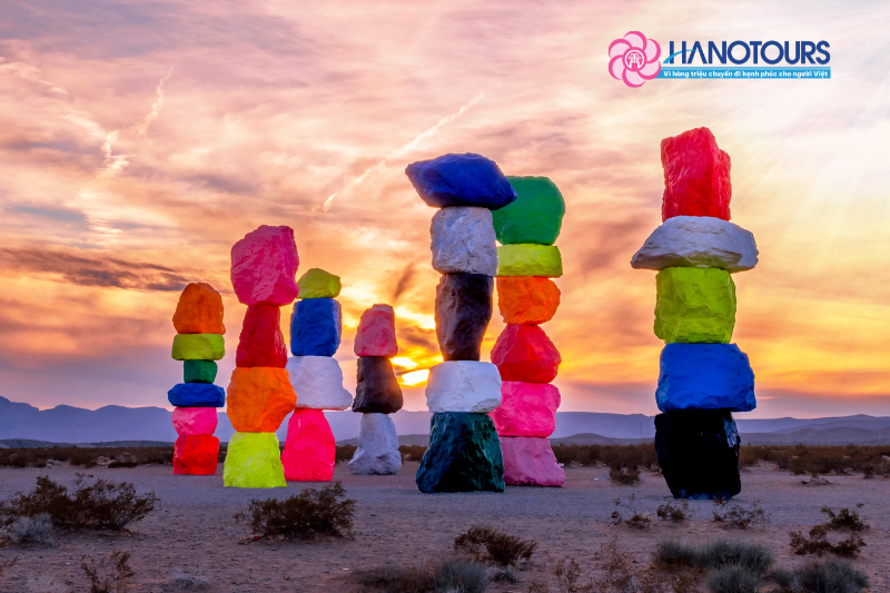 - Seven Magic Mountain hay còn được biết đến với tên gọi công viên đá 7 màu là một tác phẩm nghệ thuật sắp đặt vô cùng độc đáo tọa lạc ngay bên cạnh xa lộ Interstate, thuộc khu vực phía Nam của Las Vegas. Điểm nhấn chính của công viên nằm ở 7 cột đá khổng lồ xếp chồng lên nhau một cách cực kỳ ngoạn mục. Để thực hiện được tác phẩm này, người ta đã phải sử dụng 33 tảng đá vôi cực lớn, mỗi tảng nặng từ 10 đến 25 tấn, xếp chồng chúng lên nhau tạo thành 7 tòa tháp, cao từ 9 đến 11 mét. Mỗi tảng đá lại được sơn một màu sắc khác nhau, tạo nên một vẻ đẹp rực rỡ khiến bất cứ ai khi đặt chân đến cũng phải ngẩn ngơ ngắm nhìn.
