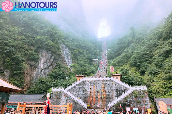 - Khi lên tới đỉnh của Thiên Môn Sơn, Quý khách sẽ đi theo con đường bao quanh những đỉnh núi, xuyên từ đỉnh núi này sang đỉnh núi khác. Một bên là núi, một bên là mây, thỉnh thoảng có thêm những lá bùa may mắn màu đỏ rực rỡ sẽ khiến Quý khách cảm thấy lạc như lạc vào chốn bồng lai tiên cảnh, như đang đi trên 9 tầng mây của thiên đường.